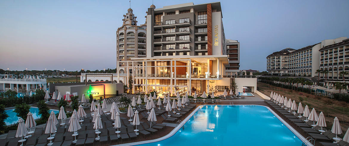 Содржини: Хотелот располага со главен ресторан со шведска маса, À la Carte ресторани со: Gusto kebab house - турска кујна, барови околу хотелскиот комплекс. Доктор, чување деца, перење и хемиско чистење, фризер, телефон, факс, интернет и компјутерски игри, продавници, изнајмување кола дополнително се наплатуваат.WI-FI интернет конекција во целиот хотел е бесплатна.Надворешни и внатрешни базени, (затворени во летниот период), релакс базен (+16), тобогани, фитнес центар, пинг понг, одбојка на плажа, сауна, соба со пареа и турска бања се бесплатни. Масажа, Wellness & SPA центар, спортови на вода, билјард, компјутерски игри дополнително се наплаќаат. Забавни програми покрај базенот или на плажа, натпревари за возрасни и деца, шоу програми во вечерните часови. Мини клуб за деца од 4-12 години со специјални програми.