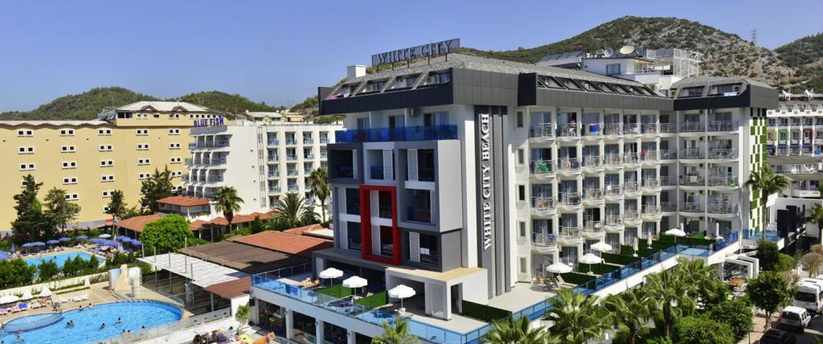 Содржини: Во својот состав хотелот содржи главен ресторан, 3 А la carte рестортани The White World Cuisine-интернационална кујна, Terrace Taverna-медитеранска кујна , The Grill. Хотелот има 5 бара и тоа Lobby Bar, The White Pool Bar, The White Beach Club Bar, Disco Bar, Vitamin Bar.Слаткарница. Располага со вкупно 3 отворени базени -главен, детски и базен со тобогани, 2 затворени базени ,од кои едниот е за деца) анимација, просторија за игри. Активностите вклучуваат аеробик, пикадо, пинг-понг, одбојка на плажа, гимнастика, ватерполо, јога, пилатес, фитнес, куглање.Со доплата се следните услуги: билијард, спортови на вода, часови по нурка, услуга за перење и пеглање, изнајмување автомобил, лекар, фризер, трговски центар, игротека , масажи, третмани за лице и тело, пилинг, витамин бар, солена просторија и парна бања,